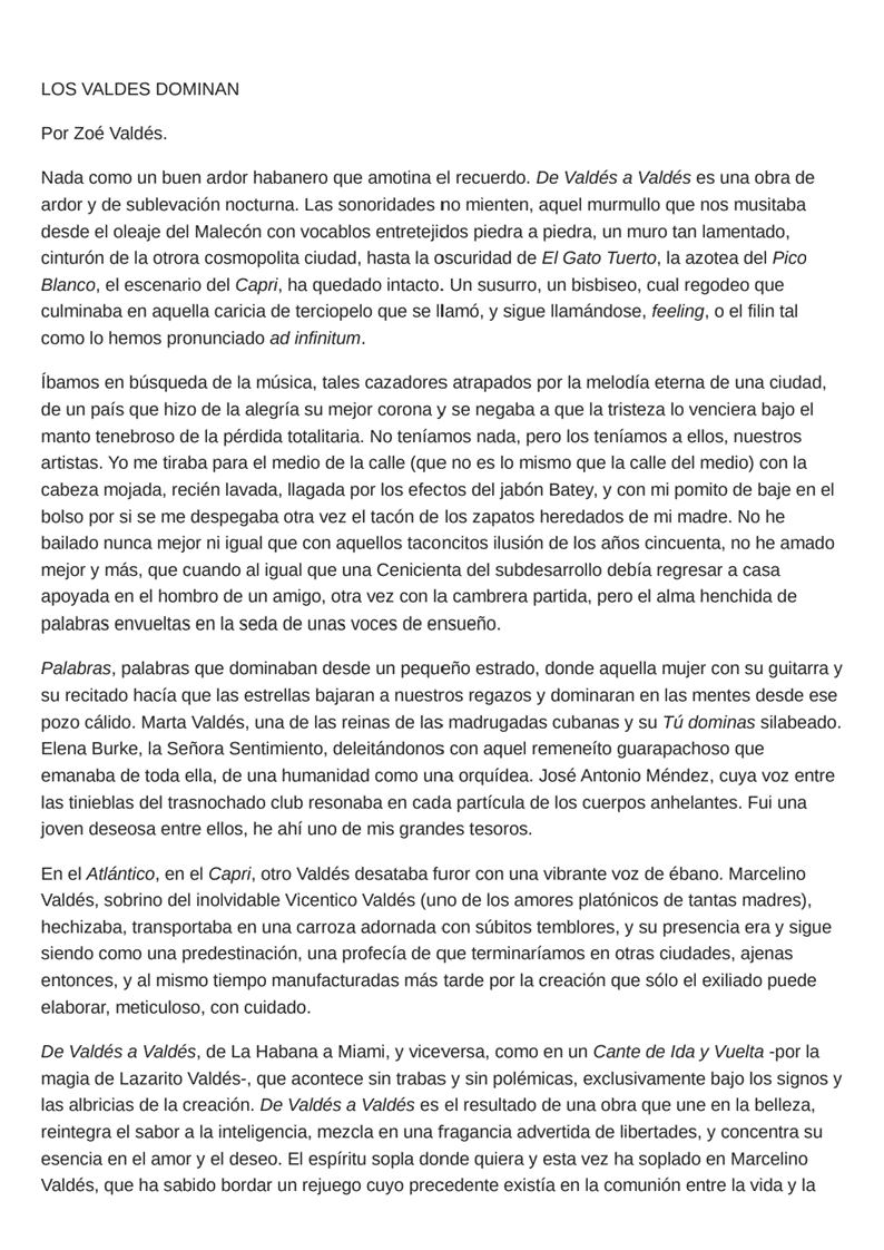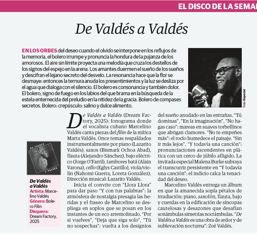 «La voz… Marcelino Valdés-Stable le rinde homenaje a Marta Valdés. De Valdés a Valdés es el próximo disco que sale pronto, un trabajo exquisito de producción y arreglos, con palabras de presentación de Zoé Milagros Valdés Martínez. El disco está concebido para los formatos de CD y Long Play (Vinyl). En fin, un lujazo para descargar. Enhorabuena Marcelino…» Denis Fortun.